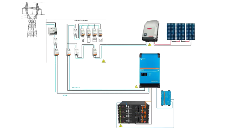 Pokud bych chtěl kombinované řešení se sítí, anebo offgrid s AC coupling, kde je využit současně jak výkon GTI střídače, tak hybridu, musel bych sáhnout po VICTRONU, kde je microgrid vytvořen na AC OUT (viz obrázek), to se mi jeví jako lepší přístup ...
