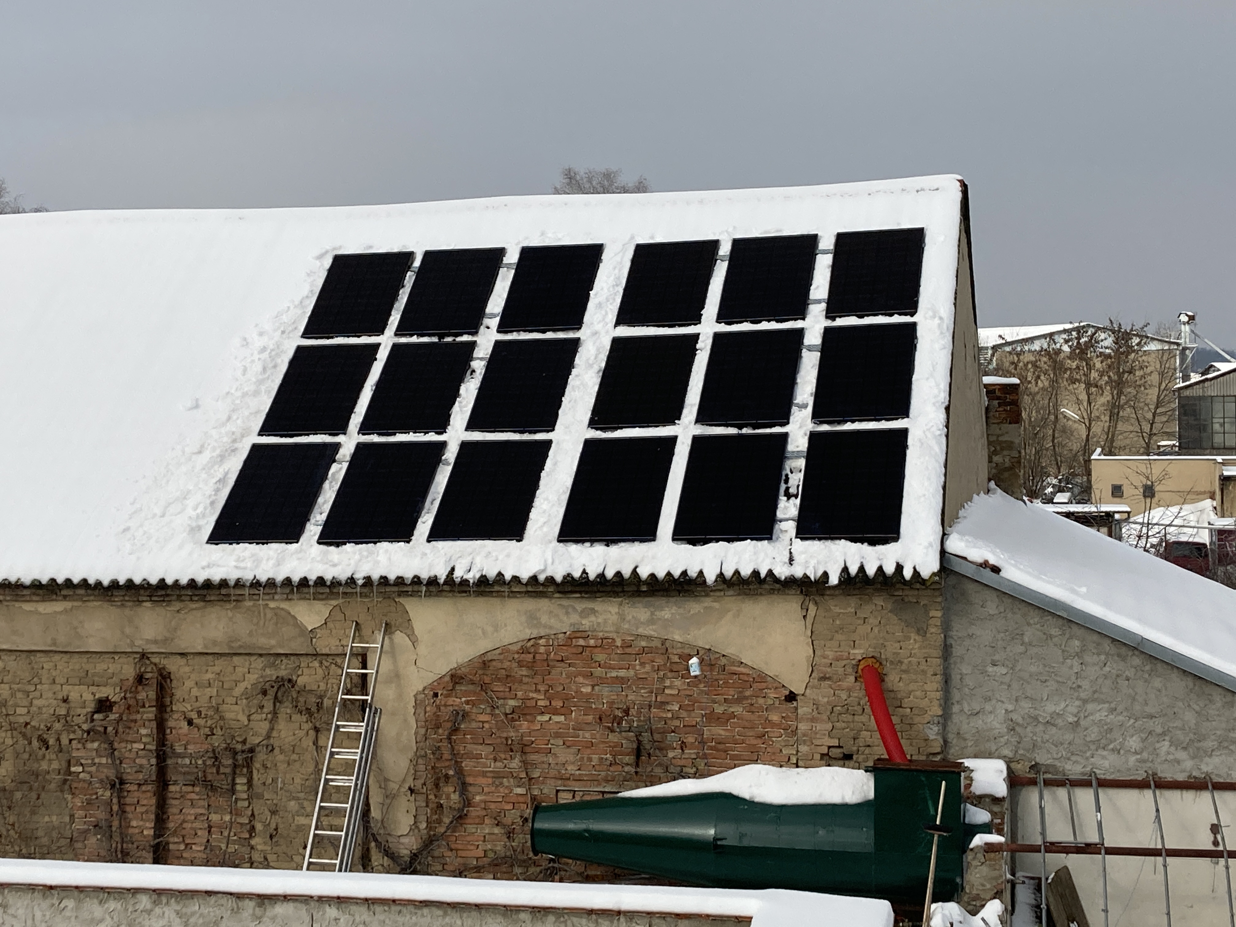 U nás na Vysočině u Žďáru nad Sázavou mrzne cca -12, plno sněhu, k panelům podél hřebenu, na střechu ale nelezu, vrstva kolikrát desítky cm sněhu a pod tím je to omrzlé,...spotřebu nám dotuje náš mazlík vodní turbínka.... A jelikož je to kašnová turbína, a krytý náhon s proudící vodou, tak je to docela chráněné před mrazem...Teď je vody docela dost, tak z reglu turbíny "leze" cca 1400 W , ale pořád, i v noci, což je tak 70% výkonu co to dá.