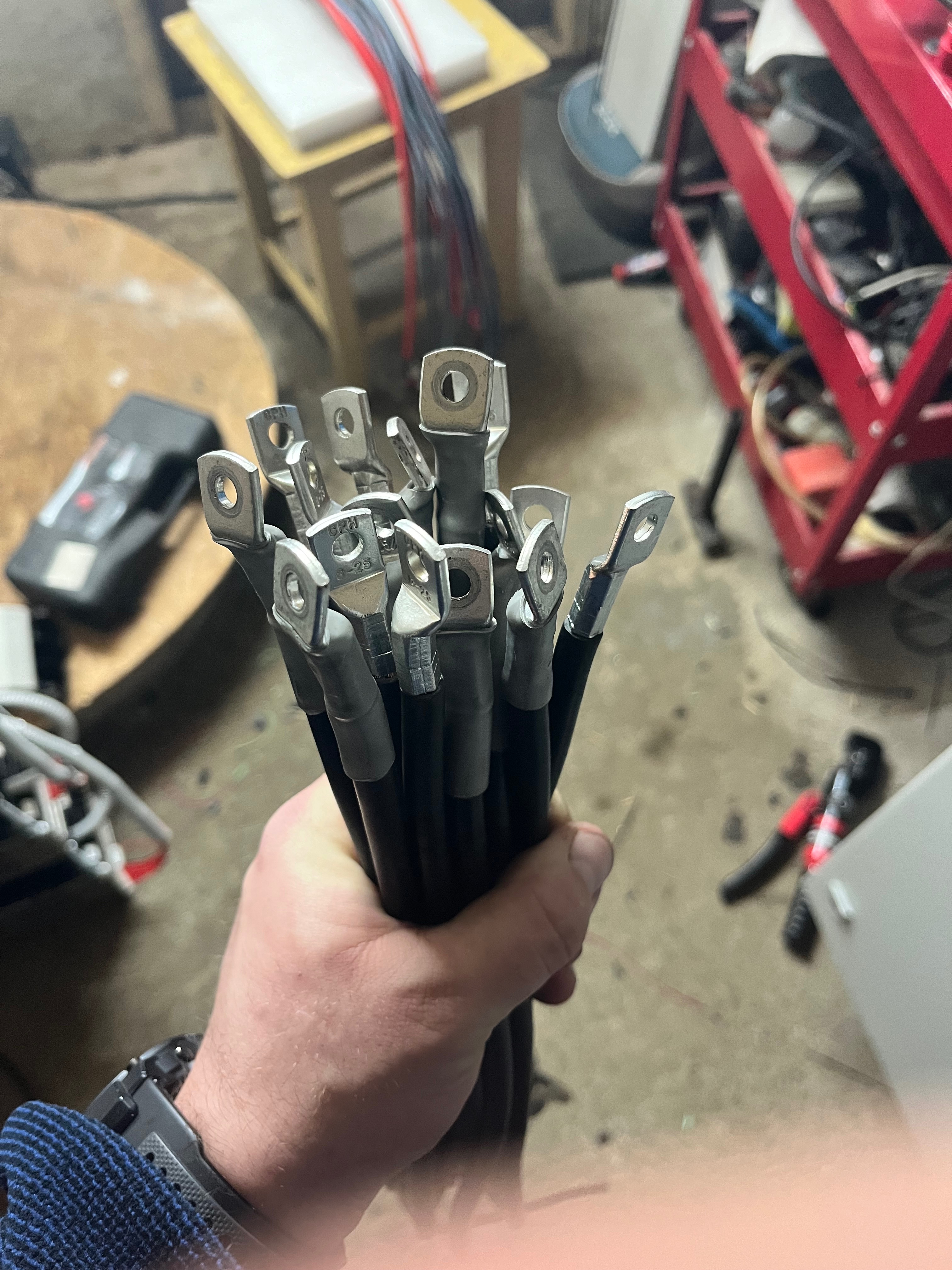 Na foto su kable co pojdu od bateriek smerok k poistkam a potom k zberniciam..od bateriek mi pojdu 25mm2 a potom ich chcem spojit aby som tolko kablov nepripajal na zbernice ale chcem ich dat napriklad len do styroch 2 plusy a 2 minusy..uvidim ako to este vyjde..