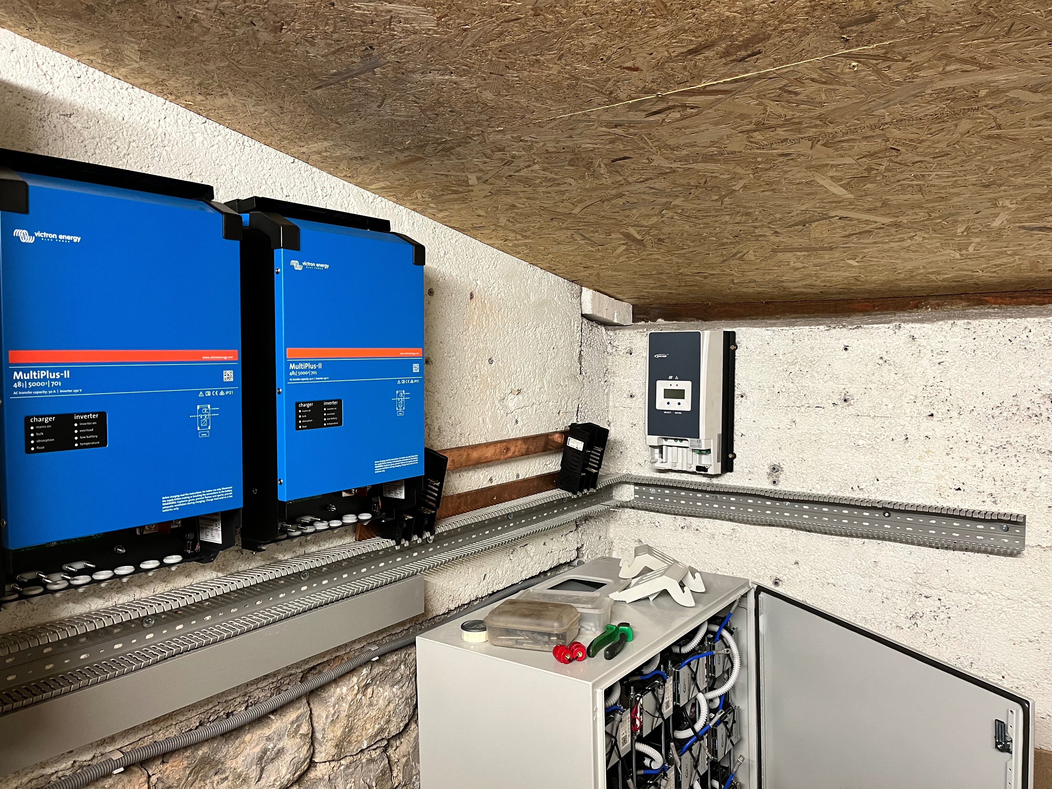 9,2kWp JV 45°, 4,6kWp JZ 45°, 2,3kWp JV 90°, 2 x Victron MP II 5kVA, 3 x SmartSolar 150/70, Smartshunt, Cerbo, 16x280Ah + 16X300Ah + 16x300Ah LiFePO4 + 3xJK BMS.