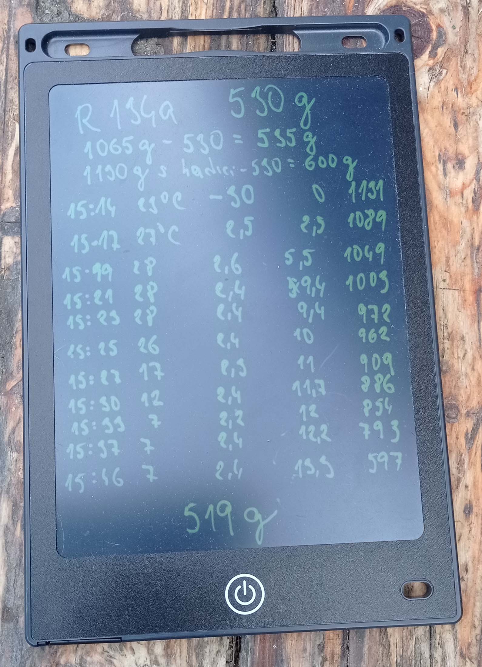 Nastartoval auto, nastavil klimu na LO a pomalu přidával chladivo R134a (do nízkotlakého portu z obrácené láhve s chladivem). Souběžně jsem sledoval a zapisoval teplotu v autě ve výdechu, tlaky na nízkotlaké a vysokotlaké části klimatizace a hmotnost nádoby s chladivem. Pro budoucí kontrolu tak vím, při jaké náplni klima přestane chladit a kolik si můžu dovolit doplnit chladiva aby to bylo bezpečné. Dle tabulek pro dané auto jsem měl dodat 530 g chladiva, nádoba měla hmotnost před plněním 1065 g a po skončení plnění 519 g, takže se vypotřebovalo 1065-519=544 g. Něco zbylo v hadicích, takže klima je naplněna asi správně. Auto je snad vyřešeno, na výstupu z klimy je při volnoběhu 7 st.C.
