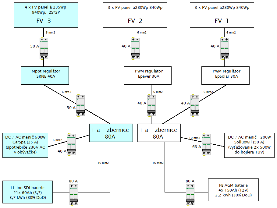 - DO a Z bateriek by nemalo nikdy tiecť viac ako 60A, kedže vyťažovače budú posielať rovno z regulátorov 40A cez menič Soluowill rovno do bojlera.