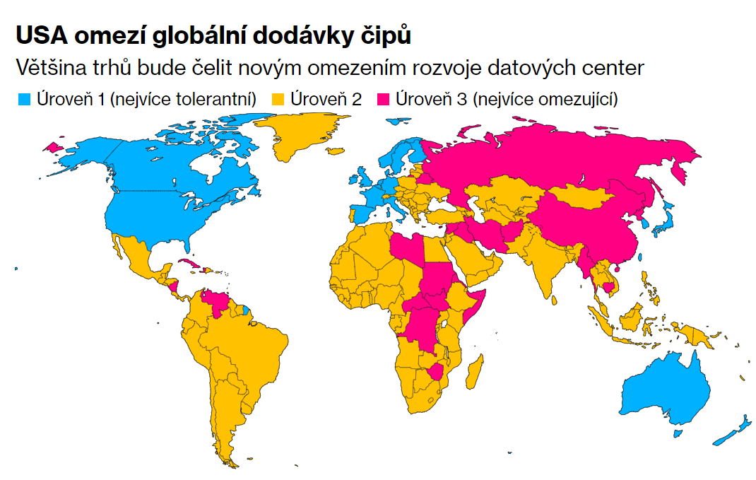 Zdroj: Omezení amerických čipů ohrozí českou AI (umělé rozdělení zemí EU na blízké spojence USA a ty ostatní včetně Česka).