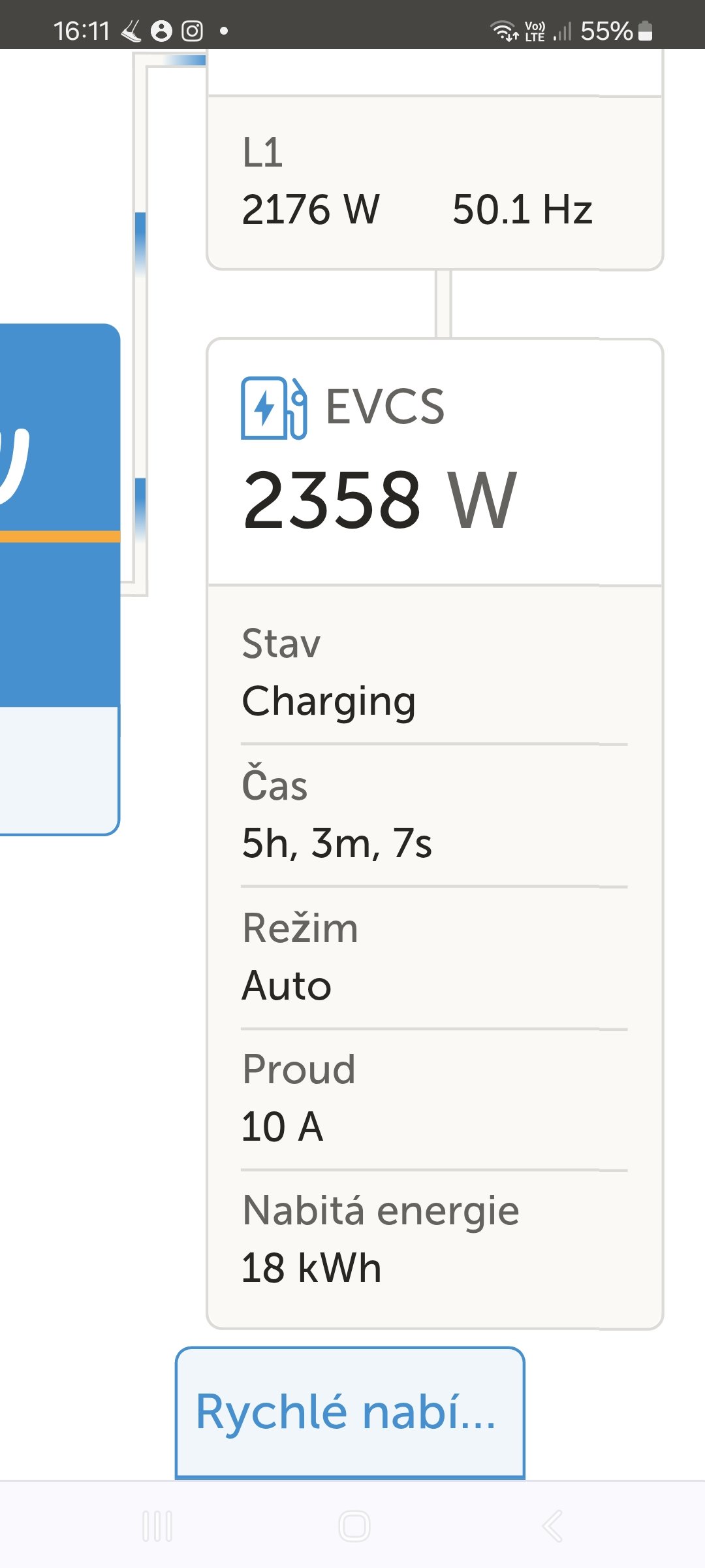 Ten Victron 5000 je na nabíjení EV opravdu na hranĕ.Dnes jsem v 11:00 napojil EV a nastavil 18A a po 4 hodinách jdu okolo a na mĕniči svítí Temperature a dobíjení zeslabeno na 1500W po 5 minutách kontrolka zhasla a najel na plný výkon.Jak často to dĕlá netušim.Tim než protlačim 40kWh do auta to je hrozná doba.