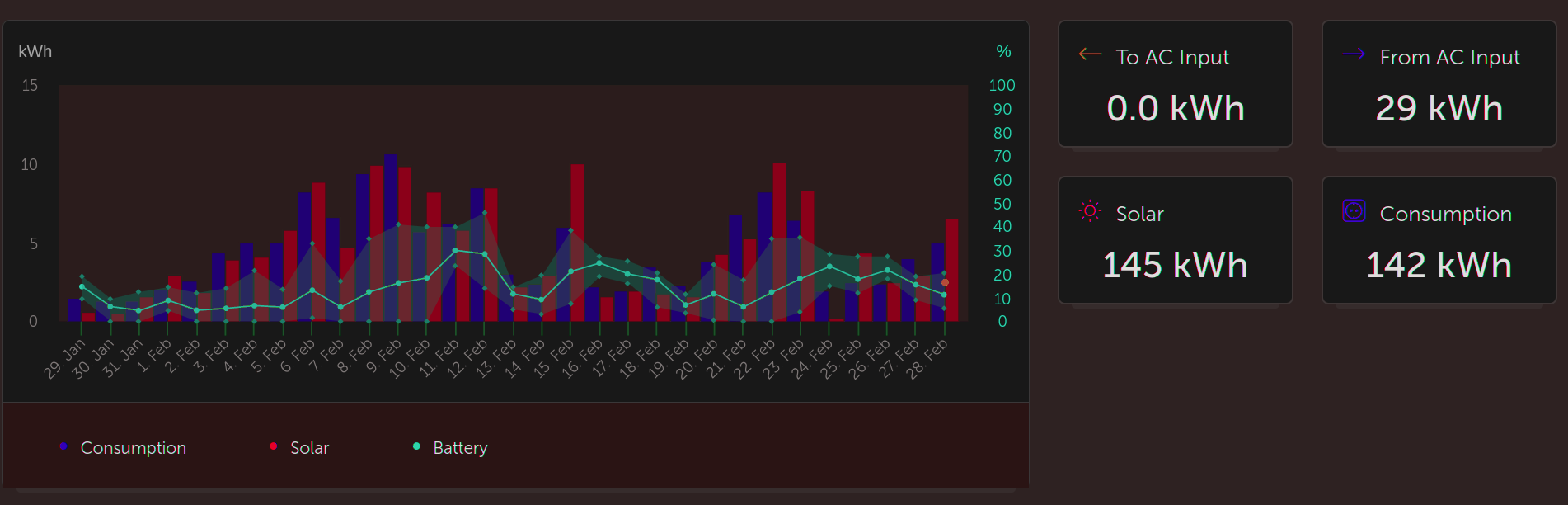 Ahoj Petře, from AC input 29kwh je z druhého měniče, nebo DS ? Máš tam dvě Fve, ale nějak mi to sesedi k tomu grafu z VRM. Já to mám za Únor takto, ale něco málo jede ještě z DS !rottenkiwi píše:POkracujem v 100 % ostrove. Data za februar: