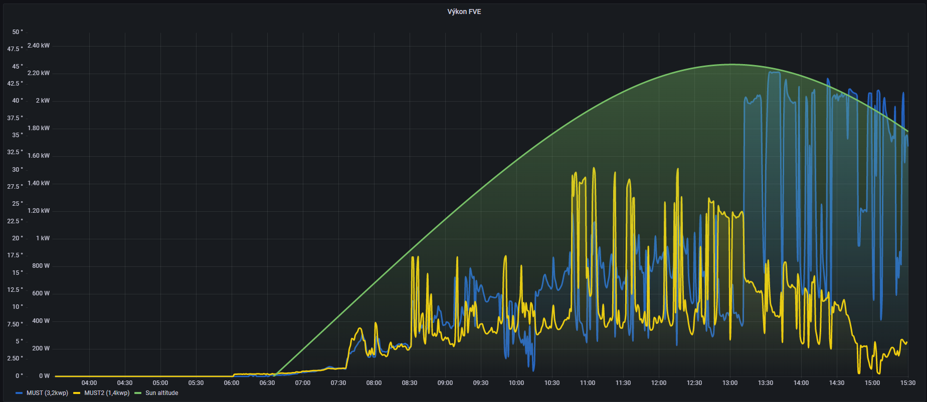 Dneska jsem pozoroval chování MPPT které se dnes zapotí... Dopoledne běžela 1kw spirála a zbytek do baterie, po poledni jsem zapnul na druhém měniči druhý bojler 2kw odběr. Pak jsem sledoval MPPT a umí reagovat dost slušně na změny během pár vteřin desítky ampér nahoru. Dnes jak je ale chladno jsem narážel často na maximum jednoho z měničů na jeho MPPT. Občas si měnič pípnul při prudkém osvitu panelů ale držel a makal jak má. Teplota do 40°C jak MPPT tak AC strana.
