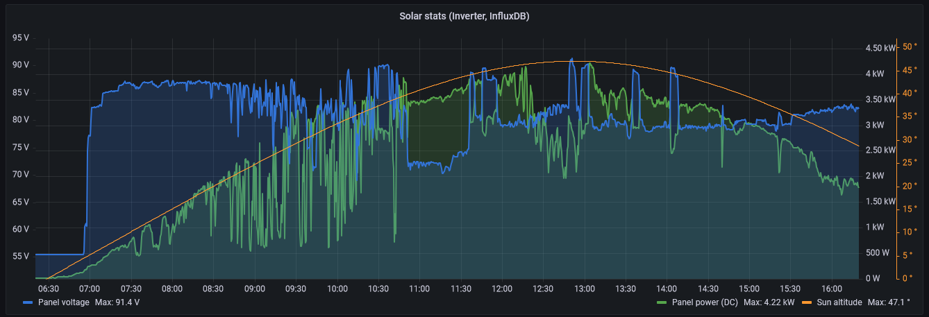 Přidávám graf jak dneska mráčky "pulzují" s MPPT. V jednu chvíli mi okolo 14h. šlo z baterie 110A špičkově
