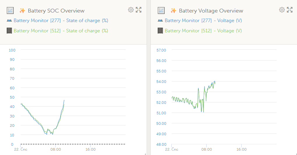 Možná je to blbý přístup polo"ostrováře", ale toto se moc řešit nechystám, prostě to nechám Multiplusy dobít ze sítě a srovnat na 100%alextccz píše: úte črc 22, 2025 9:13 pmJá si u smartshuntu nastavuju dle napětí přes Node Red i spodní hranici %. V létě se to nevyužívá, ale v zimě kdy se baterie nenabije tak často se to alespoň samo srovná.