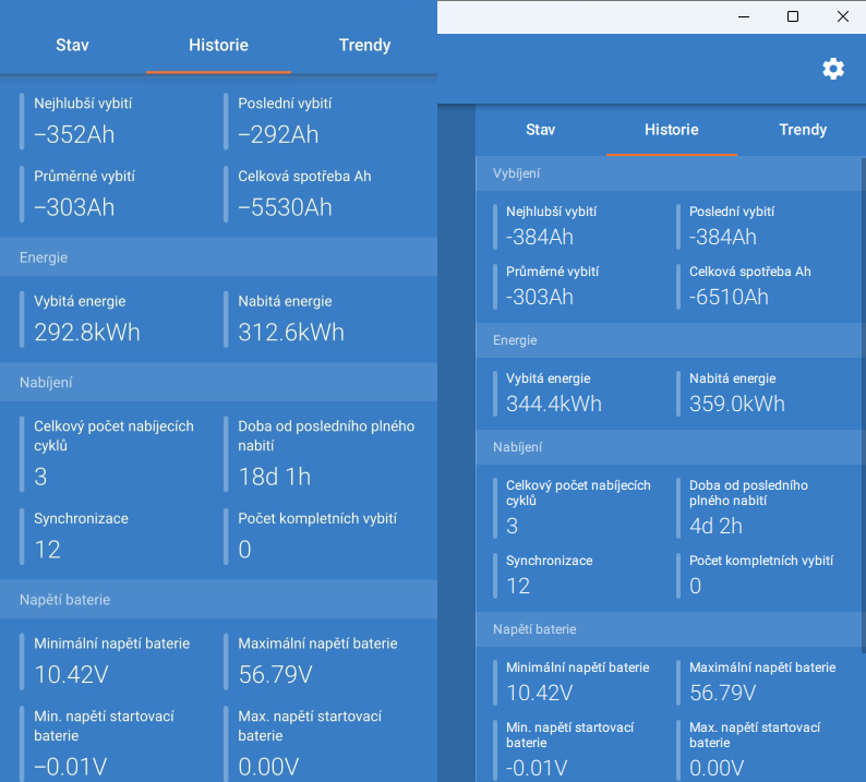 5) po 1,5 měsíci provozu hlásí BMS 29 cyklů, SHUNT 38 cyklů, rozdíl je přes 20%
