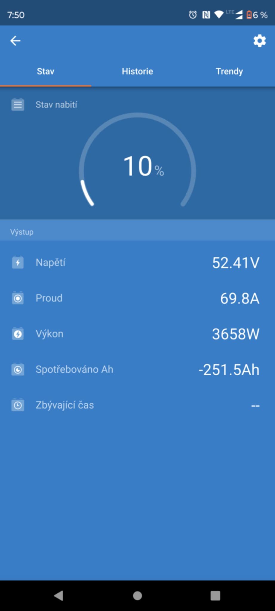Paralelně s tím zobrazuje 10% SOC = 51V na baterii, což je 3,19V na článek...