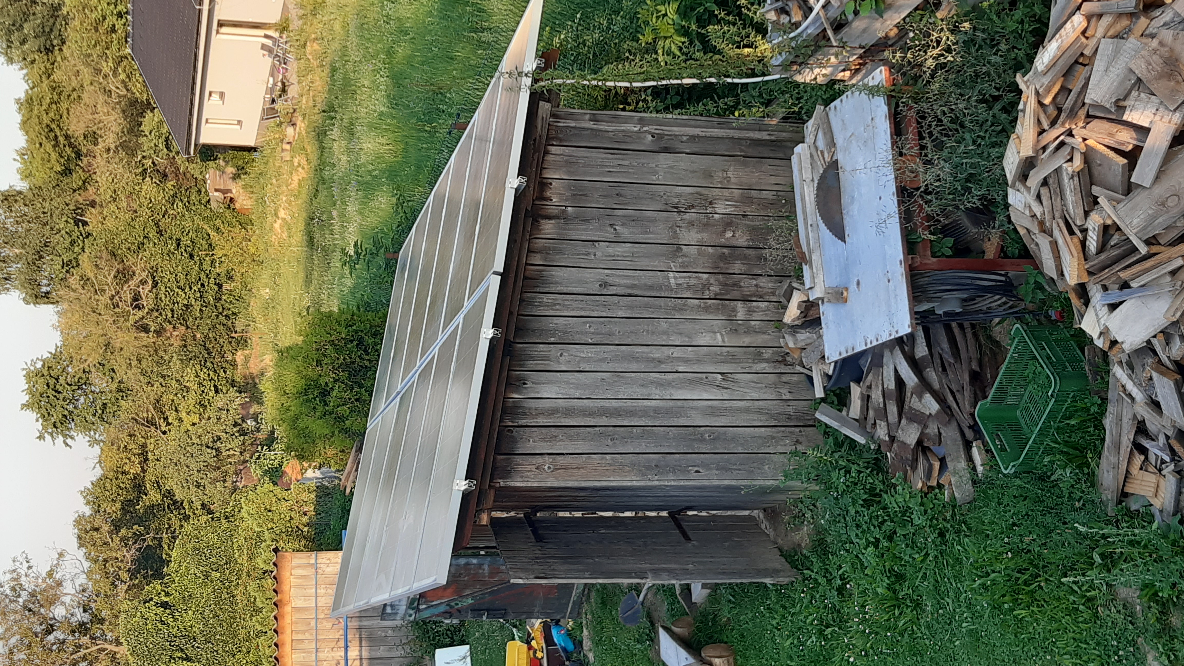 Včera došlo k obnovení střechy na dřevníku, 9 panelů dolů, hliníkové profily nahoru a 12 panelů nahoru. zapojení klasika bude 3S4P, napojeno na fangpusun, příprava na zimní pobírání ambientního světla.