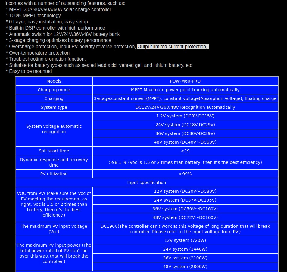 Takže můžeš udělat string s 200V a max 35A což je 7000Wp ovšem dostaneš z toho na výstupu při 24V baterce 1720W a 48V 3440W samozřejmě takto to přehánět je blbost, ale když dám místo 1720Wp 3000Wp tak se nic nestane.