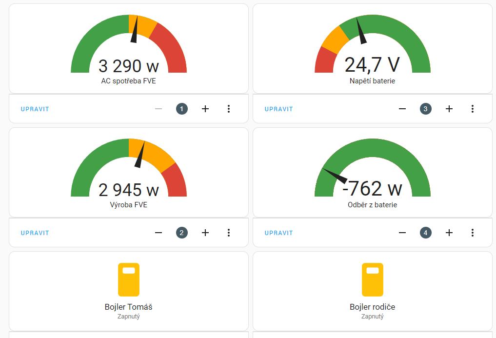 2x MUST PH1800 5.5kW, 9kWp V+J+Z, 600 Ah LiFePO4 s BMS JBD 200A, SW: Home Assistant na Synology DS923+ ku tomu ESPHome, Tasmota, MariaDB, InfluxDB, Telegraf, Grafana, Zigbee2MQTT..., HW: ESPlan (ESP32 + LAN 8720 + RS485). Nejaké moje projekty: MUST-ESPhome, ELTEK Flatpack2 ESPhome, ESP32-EMON, PZEM-017@WiFi, diyBMS-CurrentShunt-ESPhome , BMS UART-TS485 adaptér
