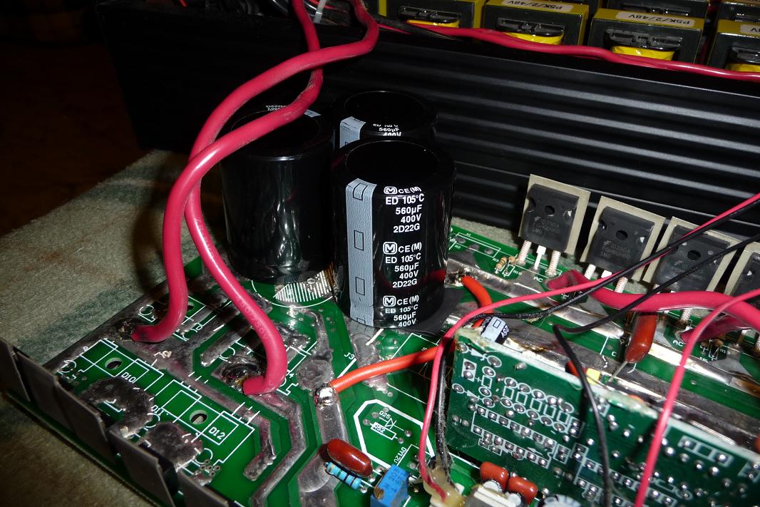 Pro jistotu sem se rozhodl vyměnit ty HV kondry , origo sou 450V 330uF Jingai pět kusů (1650uF) za 400V 560uF Panasonic čtyři kusy (2.240uF) - jsou tlusčí a bude pro ně nutné vyvrtat nové díry do PCB