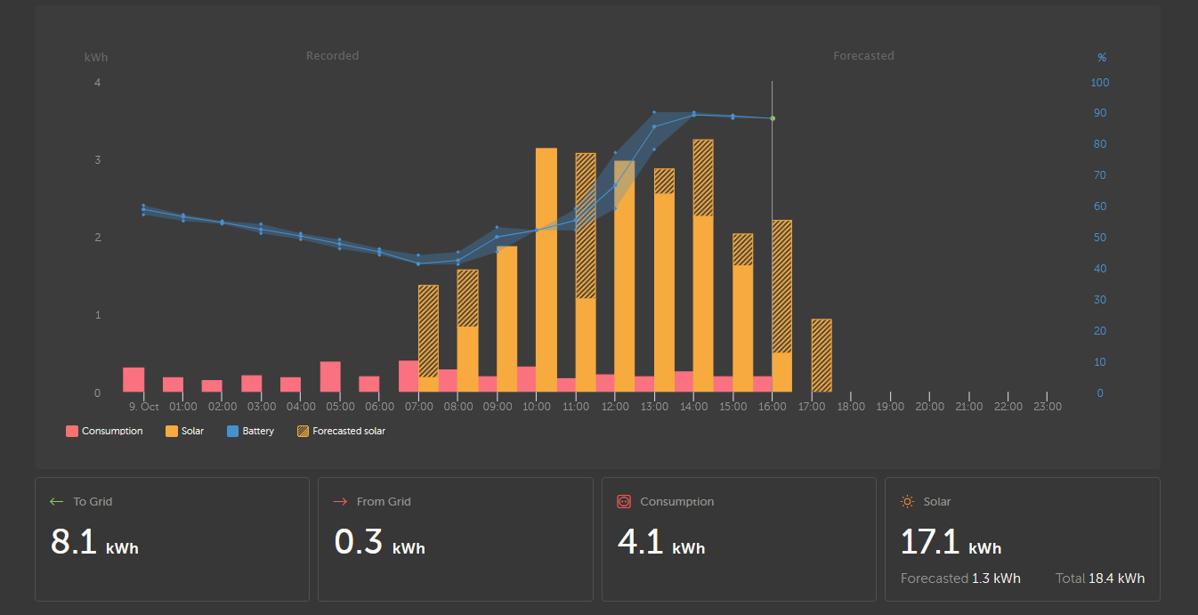U mne za dnešek 3kWh z 12,5 kWp. Bateky se drží na 75% a v boileru zůstala ještě půlka ze včerejška.
