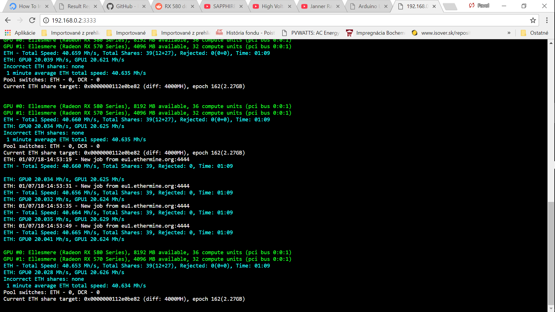 Karty nastavené cez Claymore na -cclock 1250 -mclock 2250 -cvddc 890 -mvddc 890, PC s wifi routerom ťahá zo zásuvky 760W - cez merač spotreby)