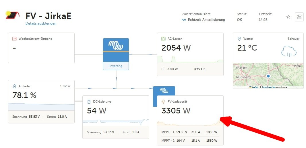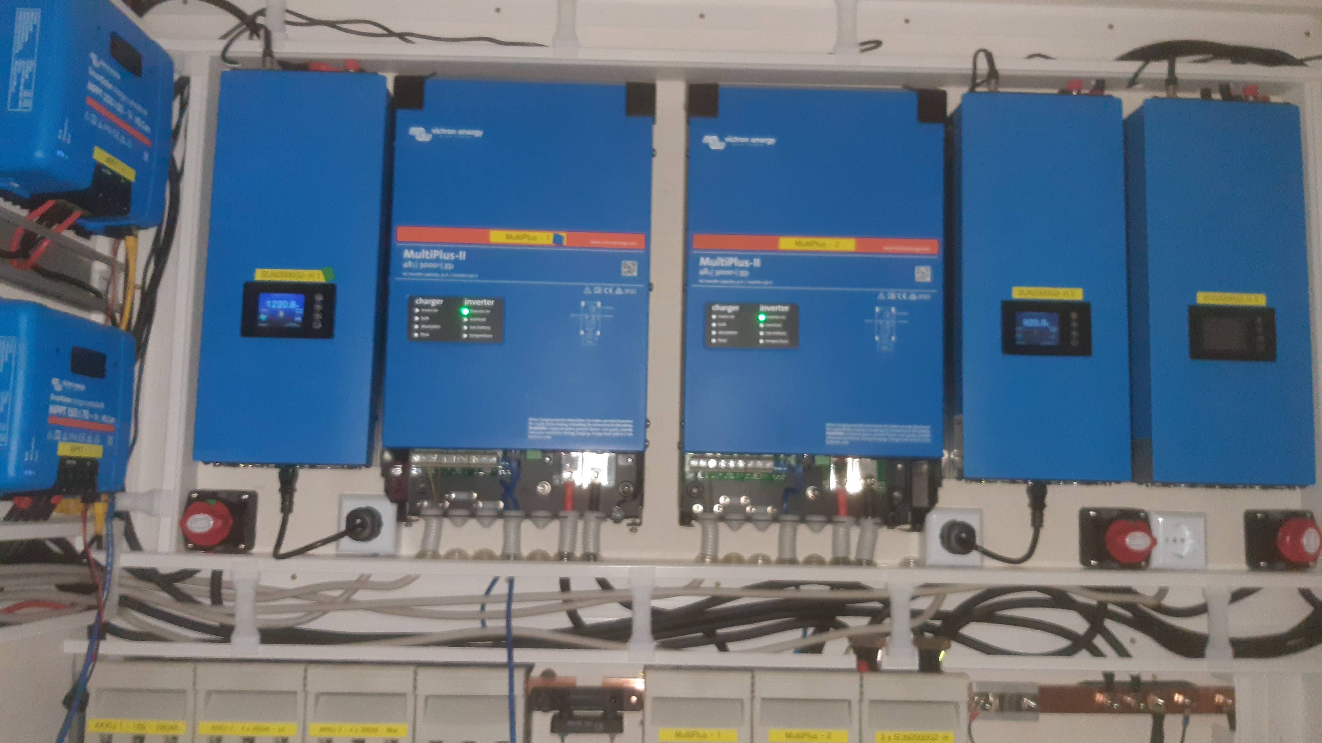 9,2kWp JV 45°, 4,6kWp JZ 45°, 2,3kWp JV 90°, 2 x Victron MP II 5kVA, 3 x SmartSolar 150/70, Smartshunt, Cerbo, 16x280Ah + 16X300Ah + 16x300Ah LiFePO4 + 3xJK BMS.