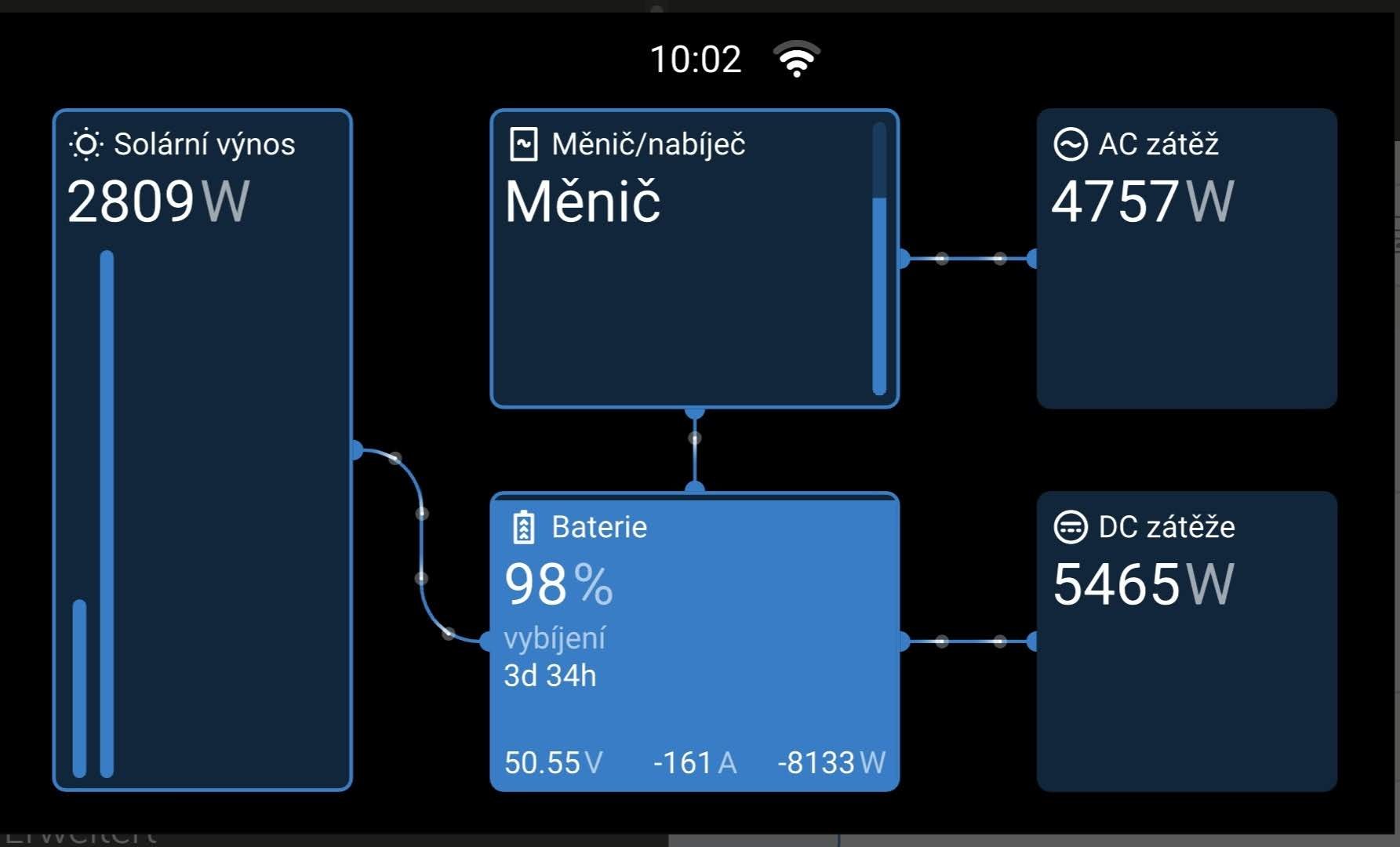 Nemám ještě úplně dodělaný vnitřní AC rozvaděč, tak nemám ještě rozhozené správně velké a malé zátěže, což se projevilo v noci, kdy spadla kapacita baterky do rána na 85%