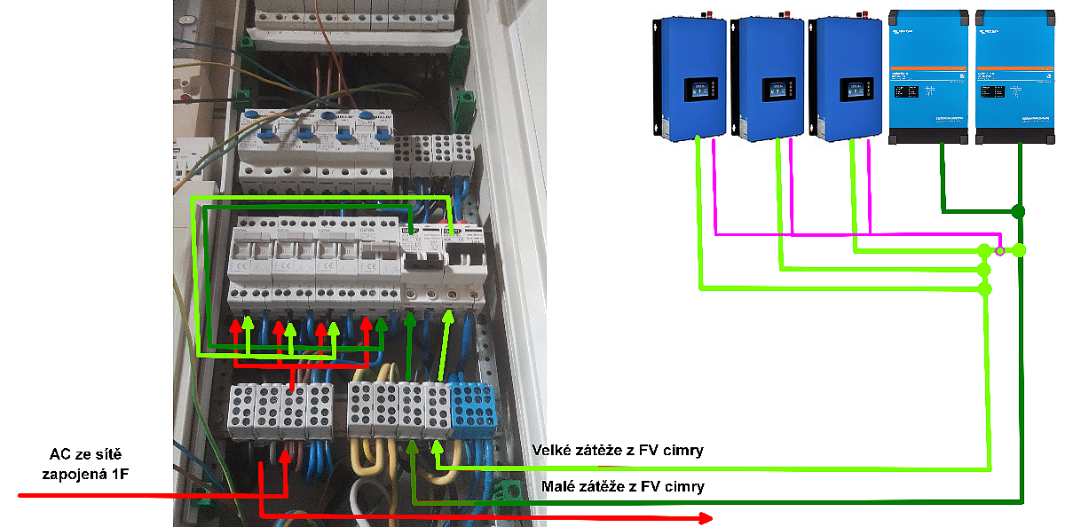 VICTRON system 3F, 3x3000VA + 1F GTI GWL 2000W posila na AC OUT.