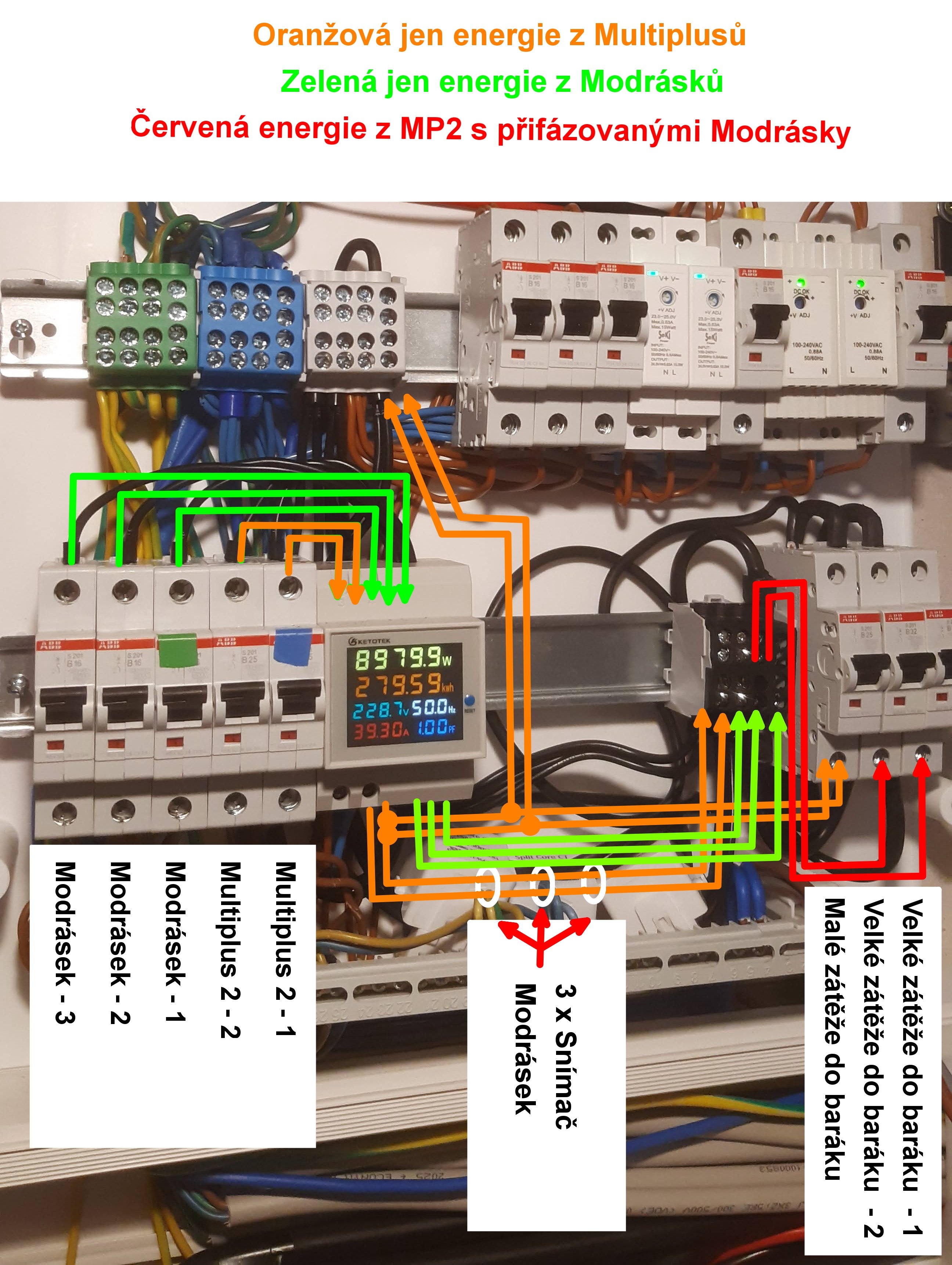 Důležité - Mikro-přetok který vzniká při vypnutí Modrásků pohltí malé spotřeby a na moment se to projeví snížením výkonu obou Multiplusů = žádný problém.