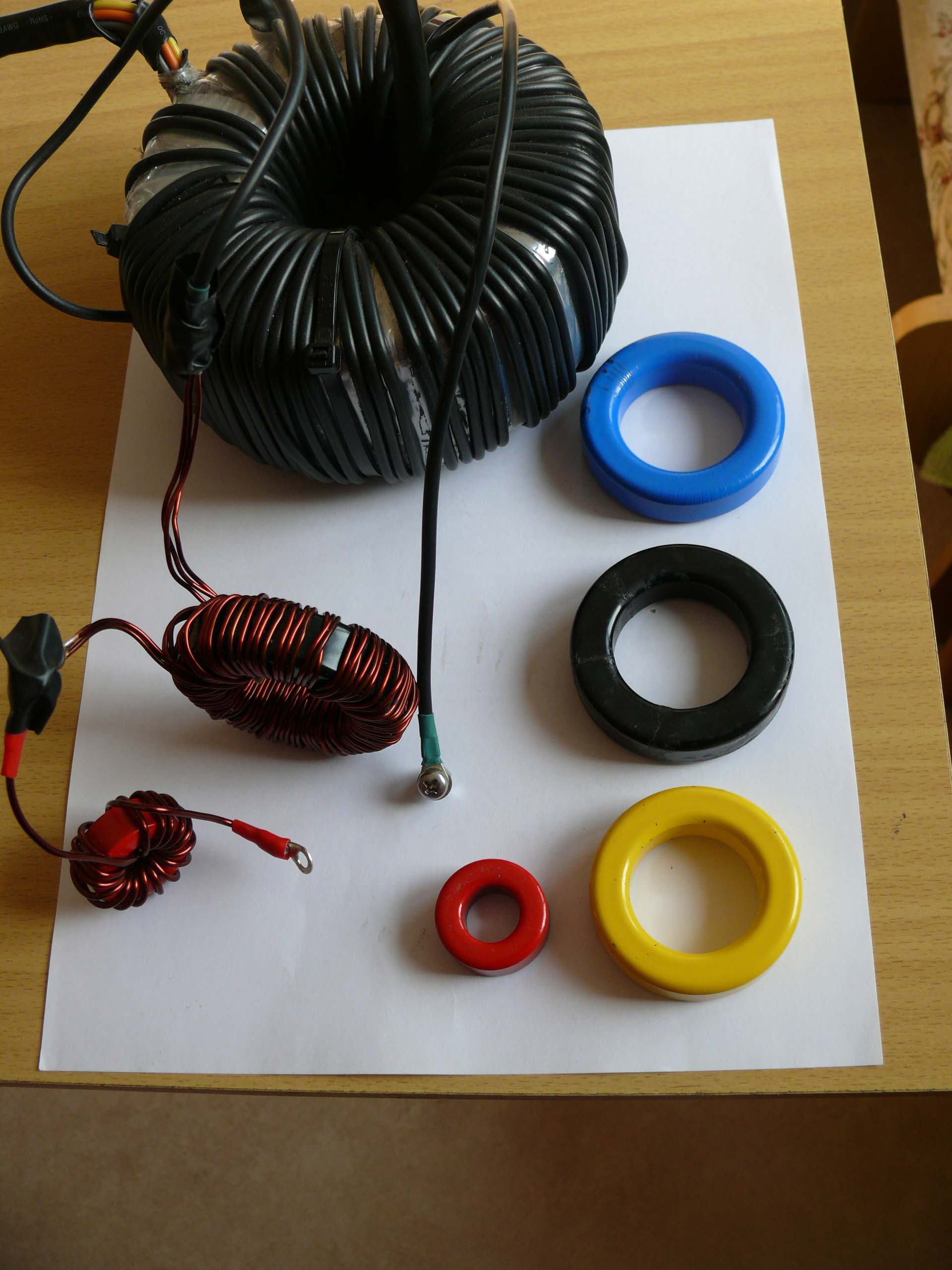 Na obrazku su vsetky testovane toroidy. Modry a cierny sundust daval podobne a najlepsie vysledky. Zlty ring (material 26) sa prehrieval podstatne viac ako modry a cierny sundust.