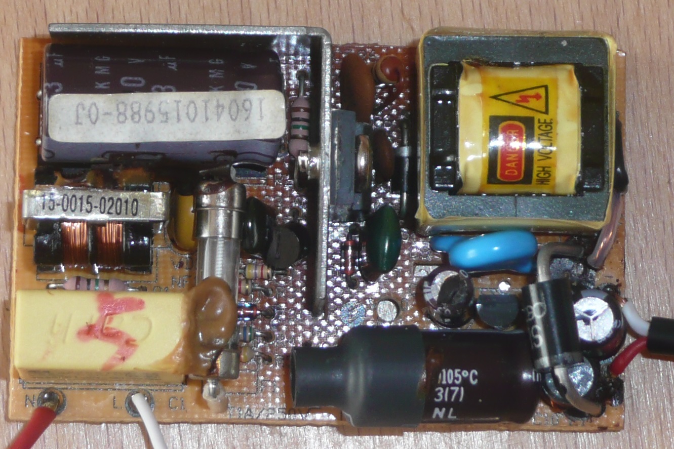 Ten opálenej plošnák je ve skutečnosti jakási barva nebo kalafuna a optočlen je pod tou čepičkou výstupního elytu. Co jsem to srovnával s těmi měniči z ebaye, tak na mě konstrukce toho zdroje dělá celkem dobrý dojem: