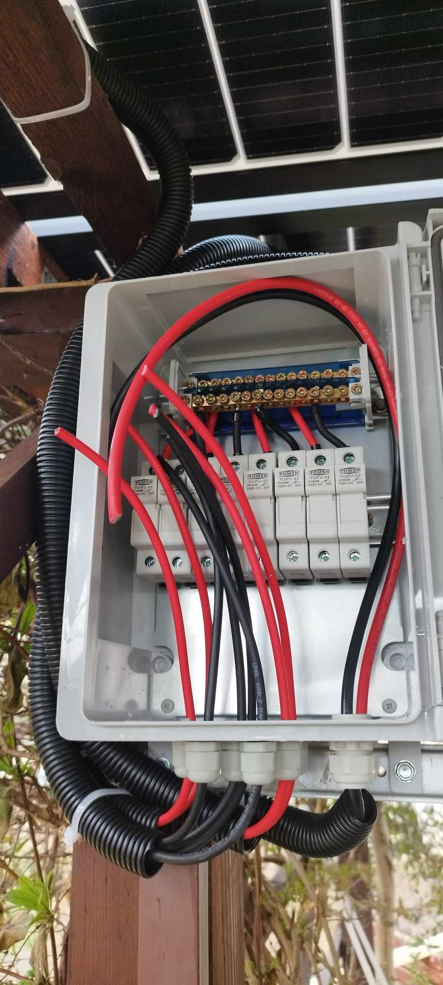 namontováno 3,2Kwp. rozvaděč s pojistkami jsem namontoval hned do pergoly, abych nemusel tahat 8 kabelů do místnosti s měniči. Takže jsem to tam poslal po společném kabelu 10mm2 do druhého FVE rozvaděče, kde to půjde do přepěťovky z ní na DC jistič a pak do MUSTU.