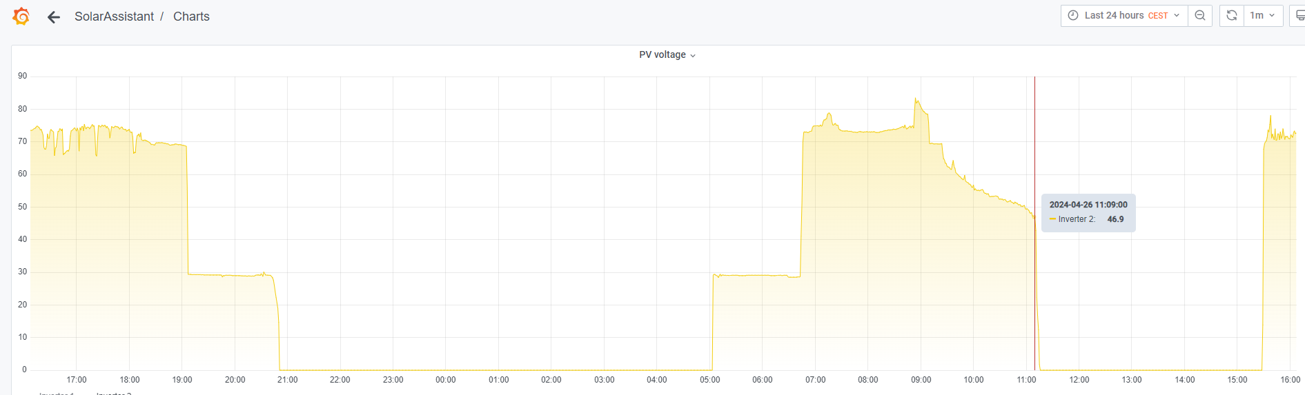Tenhle týden mi to samé udělal Epever Tracer AN, zrovna jsem stál u měřáků a vidím, že hledá mppt bod a projel napětí od 120V (naprázdno) až do 60V (napětí baterek) a vrátil se někam na 110V. Mám přepanelováno jen lehce, ale je fakt, že při nadměrném přepanelování by to mohla být jeho smrt.bokser01 píše: pát dub 26, 2024 4:15 pmJeden z měničů se rozhodl jít s MPPT bodem razantně nízko oproti normálu