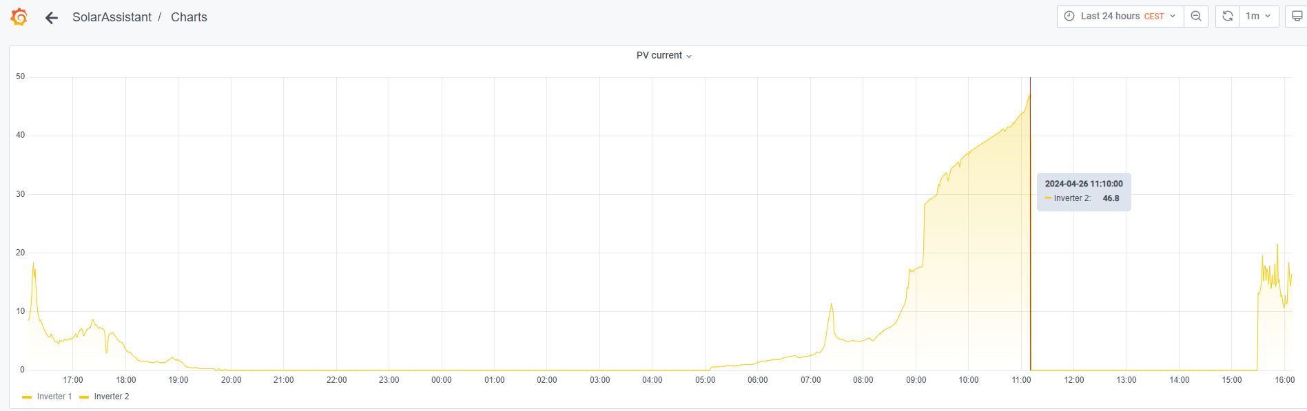 Slunce bylo asi tak silné a jak je chladno, že MPPT se chytil max výkonu na o dost nižším napětí než normálně skoro o 30V a tím pádem proud z panelů oproti ostatním dnům do dneška nebyl do 30A ale přes 40A