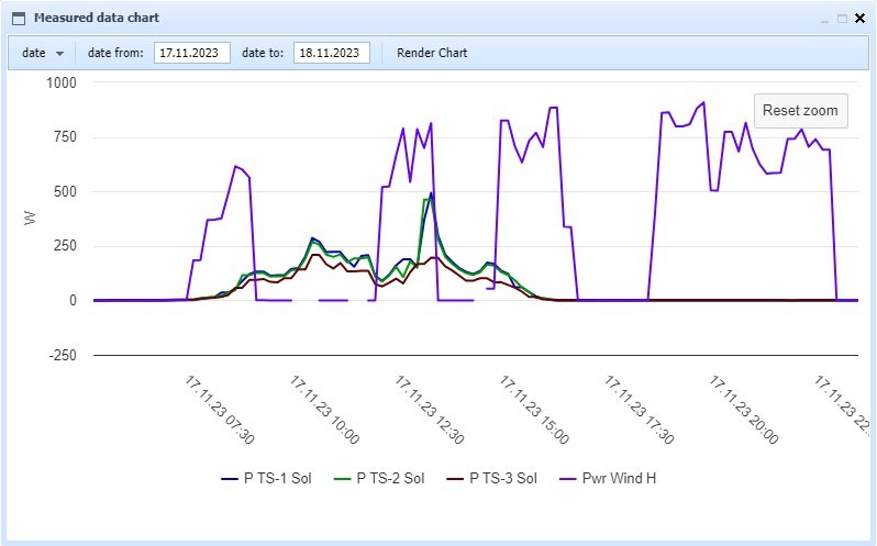Tady bohužel i za slunného dne již žádná hitparáda, sice se to klidně dostane i na peak okolo 3,5kw výkonu, ale den už je hrozně krátkej...