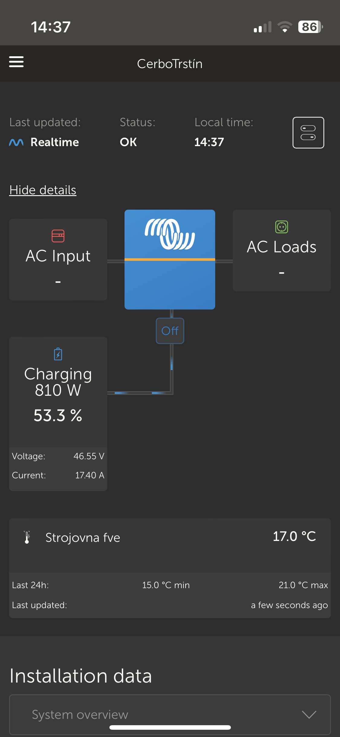 ostrov skoro 8kWp neustále ve stádiu zrodu: smartshunt(ex WBJR), MPPT150/45, MPPT 250/100(ex midnitesolar 150 clasic lite), 16S a různě P cca 340Ah Winston, MP II 5000,( ex Powerjack 8kW, ex samodomo cca 4kW). 48V DC rozvody a spotřebiče.