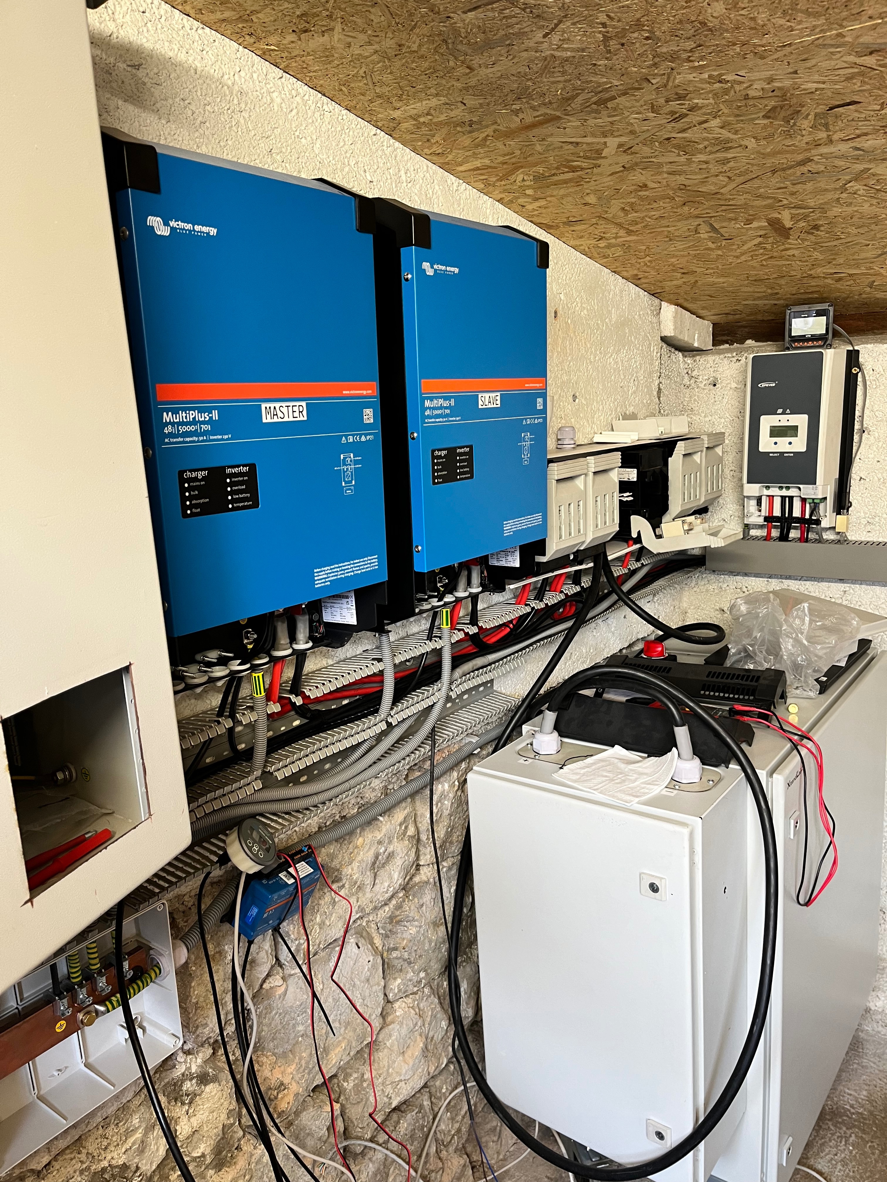 9,2kWp JV 45°, 4,6kWp JZ 45°, 2,3kWp JV 90°, 2 x Victron MP II 5kVA, 3 x SmartSolar 150/70, Smartshunt, Cerbo, 16x280Ah + 16X300Ah + 16x300Ah LiFePO4 + 3xJK BMS.