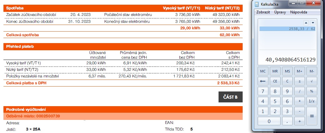 Dle fakturace ČEZu je pro mne skutečná cena elektřiny 40,93 Kč/kWh. A to je ještě v období se starými cenami distribuce. S novými distribučními cenami by to bylo kolem 70 Kč/kWh. To už by se vyplatila elektrocentrála i s benzínem v ceně za 40 Kč/litr.