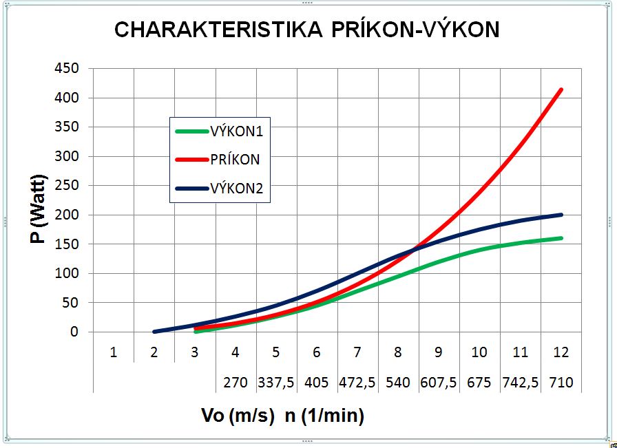 Pre vlkazajac- otáčky sú priamo úmerné rýchlosti vetra, takže to zobrazenie sedí samozrejme len pre vrtuľu, ktorá je navrhnutá presne k charakteristike generátora za predpokladu, že v rozsahu Vo od tých 4 do 10 m/s je rýchlobežnosť približne konštantná. To nie je žiadny vedecký graf, len som chcel naznačiť, že pri správnom návrhu vrtule ku generátoru, ku ktorému máme presne zmeranú otáčkovú charakteristiku u PMG netreba regulovať nič. Ten vzťah otáčky a rýchlosť vetra: napríklad ak sú otáčky pri Vo 4 m/s dajme tomu 5,5/sek (začiatok nabíjania), tak pri Vo=10 m/s budú 13,75 m/sek (nárast Vo aj otáčok 2,5 krát, nehráme sa s drobnými). Potom pre vrtuľku s priemerom 1,17 m (plocha 1m2) bude rýchlobežnosť cca 5, čo je vo dobrom bode krivky účinností pre trojlistové vrtule. Pri vetroch nad 10 m/s treba samozrejme vrtuľu chrániť, samotné brzdenie nestačí.