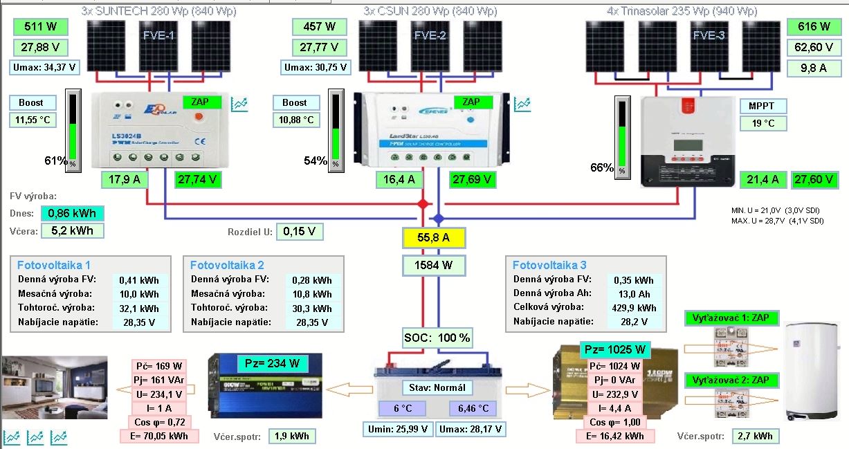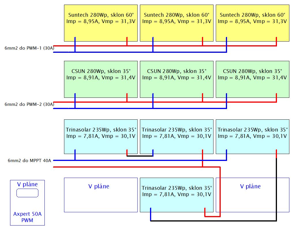 No a ostalo by mi teda 6ks 280Wp panelov a tri existujúce regulátory: 2x30A PWM a 40A MPPT (Srne).