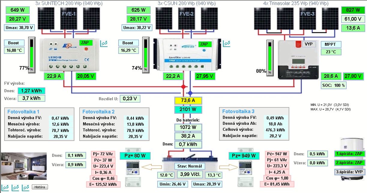 Ahojte, potrebujem poradiť, resp. nejaké tipy a nápady - rozmýšlam kúpiť kombi-menič PS3K-2450. Zámer je ho využiť ako 2,45kW menič a zapojiť za neho všetky tri okruhy špirály v bojlery (3x500W) - teraz idú cez menič Soluovoill 1200W. No a kedže je to aj 50A regulátor tak by sa dalo na neho zapojiť 6ks 235W panelov (4 existujúce, 2 plánované).