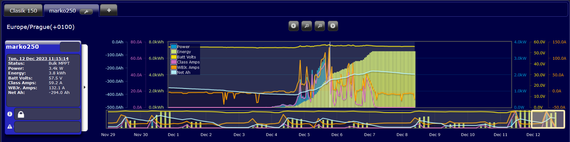 16kWp/JZ-50°/20xChaori 230 ,JV-90°/8xLeapton 650 + <JZ-90° /15xJAsolar / Mono 385, regl Midnite Classic 150<89A> , 1x EASUN <80A> a 1x EASUN <100A>,baterka 17s 54.4VDC LFP4/784Ah<uloží 42kWh>,ŠKATULE 11kW