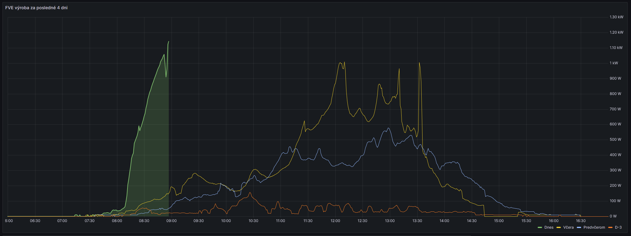 Dnes doobeda dosť oblačno, od obeda to išlo, aj keď stále s tieňami od susedovej tuje dalo 2,21 kWh/kWp.