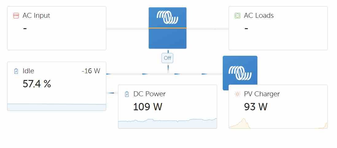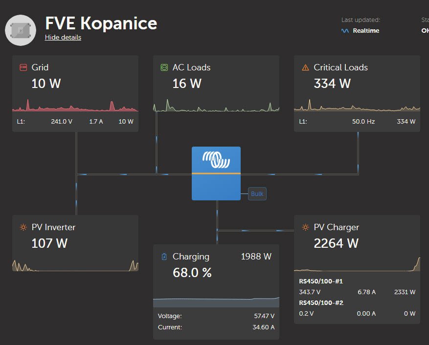 100% OSTROV SČ KRAJ = 16 panelů Canadian Solar CS3K-305; 2 větve 2S4P; 2x Regulátor Victron BlueSolar Charger MPPT 150/60; Měnič 1F Smart Phoenix Inverter 48V 5000VA 230V; Monitoring Victron BMV700 + Raspberry Pi 4B; Energy Meter ET112 a spousta kabelů.