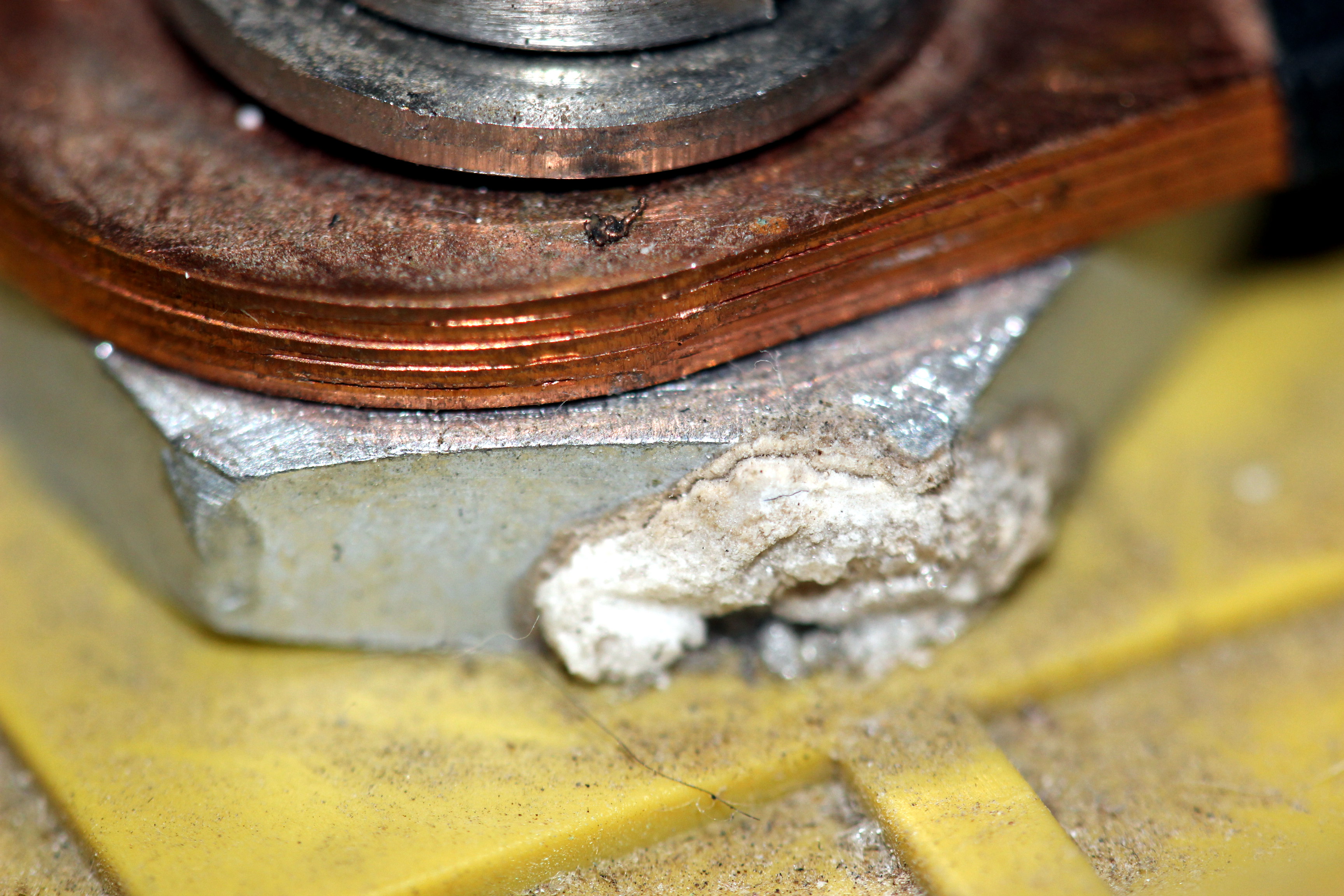 Kapacita klesá, což by mohlo být zaviněno např. únikem elektrolytu okolo uvolněného a tedy netěsného šroubového spoje u vývodu. Takovouto korozi by ale únik elektrolytu neměl způsobit.