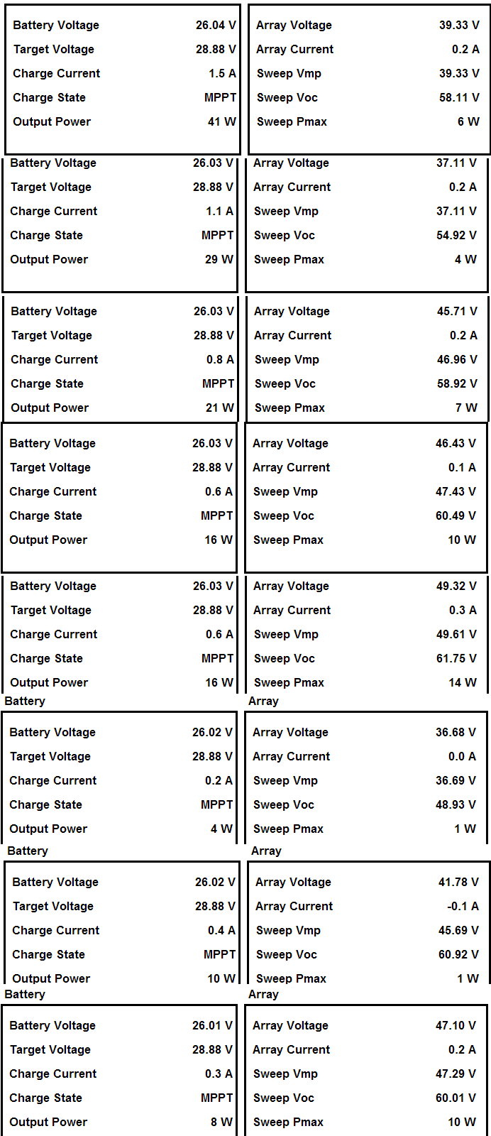 Tady přikládám k porovnání MSView data ze 2 tristárů, ke kterým mám přistup. U obou Input/Output Power přibližně sedí. Ale také oba jedou MPPT a nejsou nejsou v absorbci ani floatu.