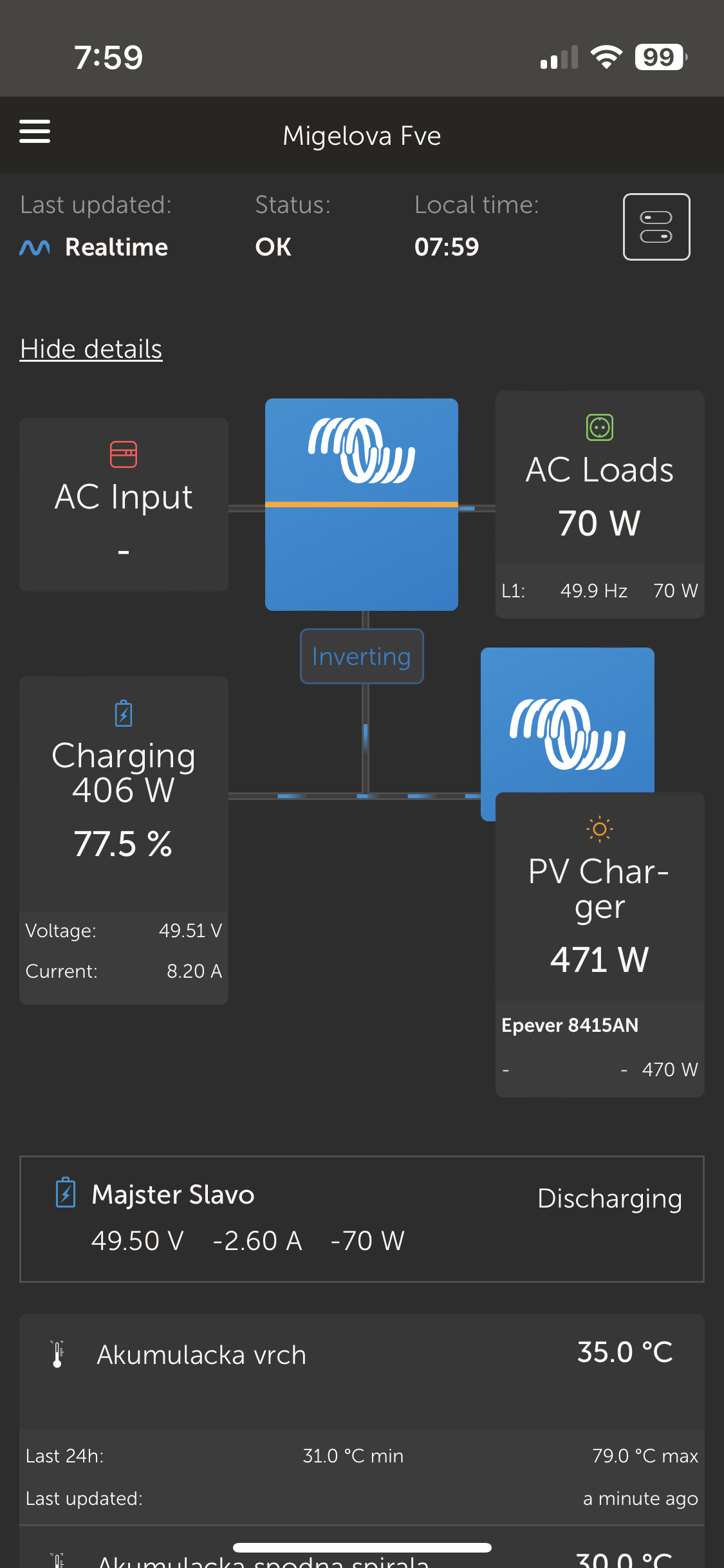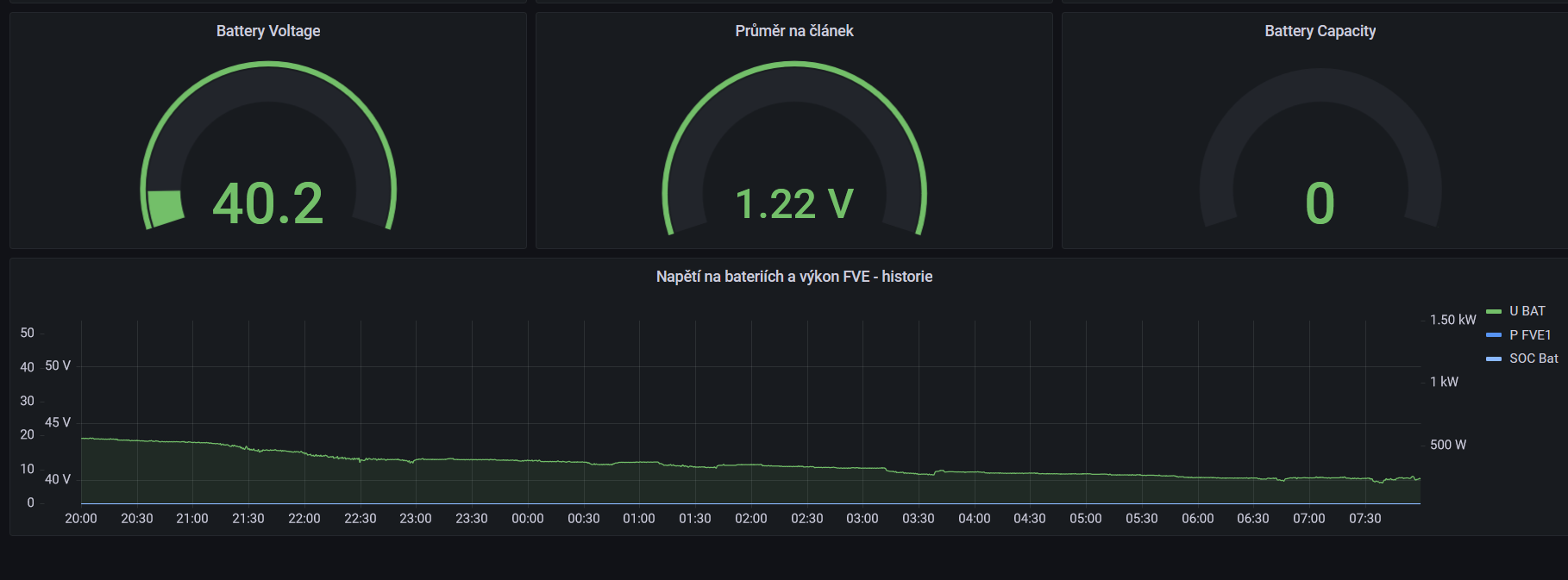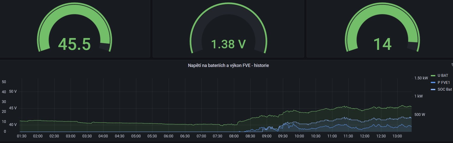 S dostatečně velkou baterkou přestaneš řešit nepodstatné detaily, jako 2 dny zataženo, jestli můžeš večer zapnout myčku, nebo pračku a podobně. Vodu v bojleru dnes asi neohřeju (včera na 67, tak bude dnes na pohodlné osprchování, a asi i zítra), v AN na topení jsem ohřál včera večer kotlem štěpkou a dřevem (přes den předehřátá FV na 40°).
