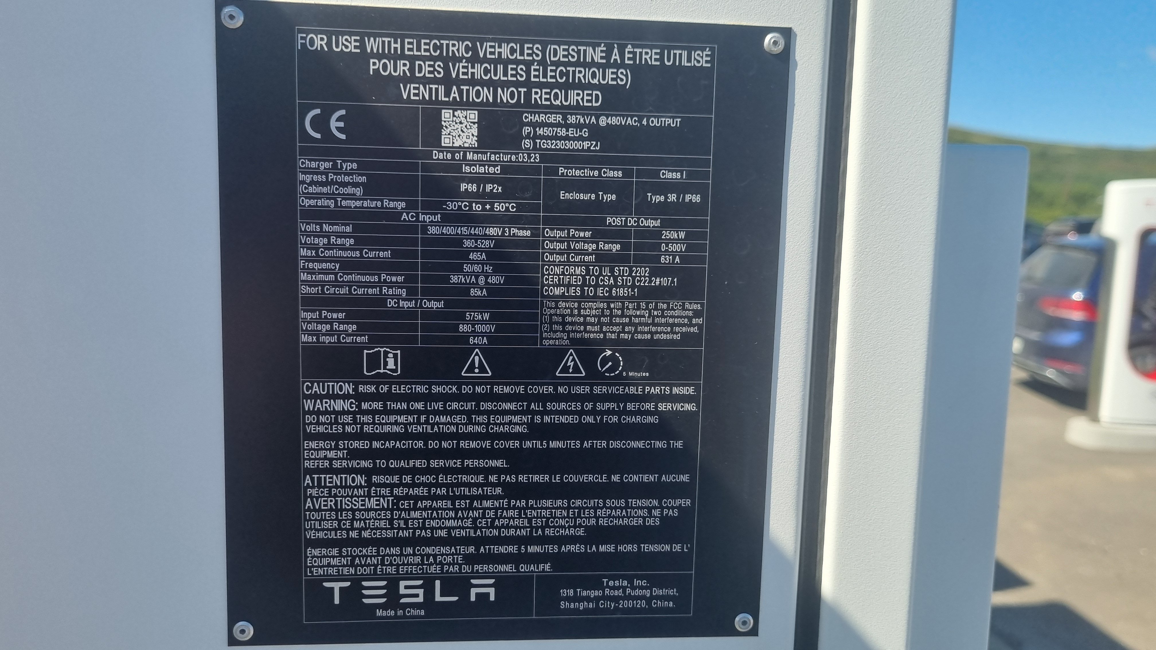 Tady je štítek ze Superchargeru Tesly, Dc Ouput 0-500Vrva píše: ned srp 31, 2025 6:01 amU jednoho FV pole mám stringy Voc 290V, které jsou zapojeny paralelně přes přepínač, který umožňuje je zapojit po dvou do série a pak mám 2x290V = 580V. Toto bez problémů používám na napájení DC/3fAC 7.5kW frekvenčního měniče pro cirkulárku. Vmpt je pak kolem 470V.