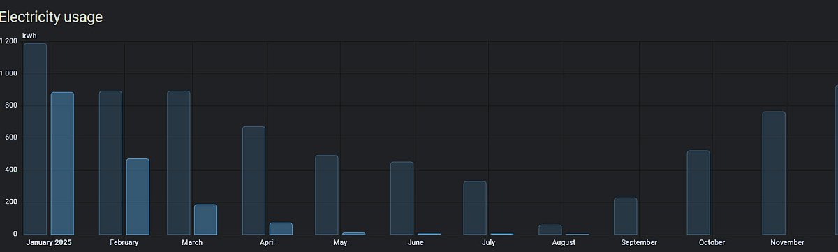 Jinak jsem v HA rozklikl porovnání spotřeby za roky 2024-2025. Tmavě je rok 2024. FVE jsem zprovoznil v Srpnu 2024, takže je tam malá spotřeba, ale od začátku tohodle roku je to srovnání docela cool. :)
