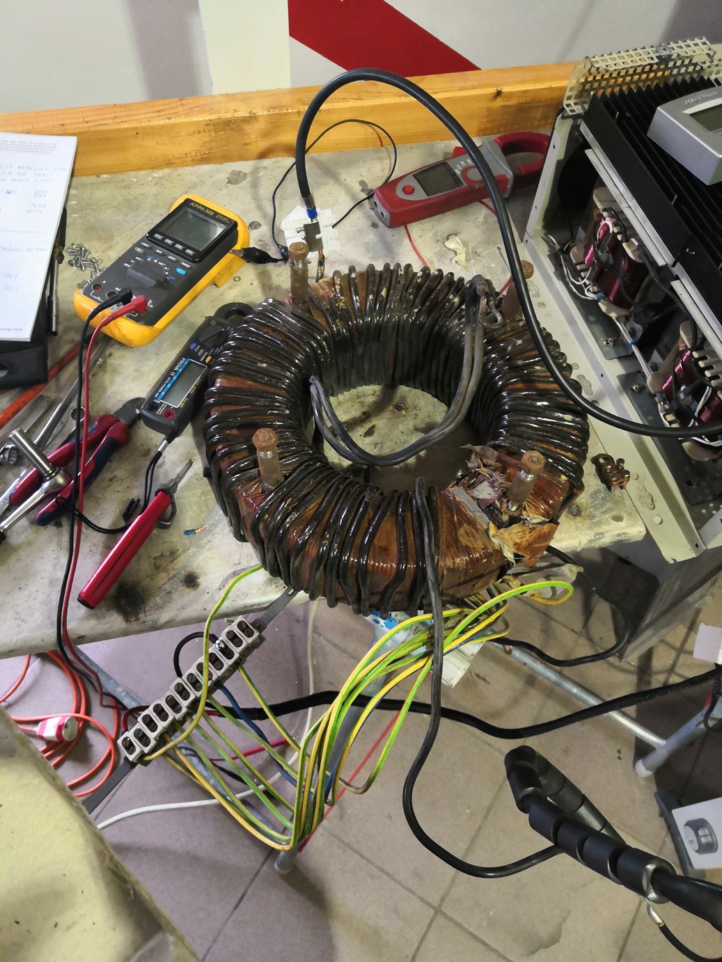 Tedy našel jsem inzerát s samodomo trafosvářečkou s velikým toroidem. Nejdříve jsem podrobil trafo bez úprav testu v měniči, ale projevilo se to, že vinutí mají malý průřez (3mm2 a 16mm2). Při vyšších odběrech se dost hřálo a výstupní napětí již nebylo na konstantní úrovni 230V. Problém u toroidu je navrhnutí průřezu jádra ve vztahu k požadovanému výkonu a navrhnutí sycení jádra. Víceméně jsem to udělal systémem pokus omyl na původním trafu a měřením klidové spotřeby.