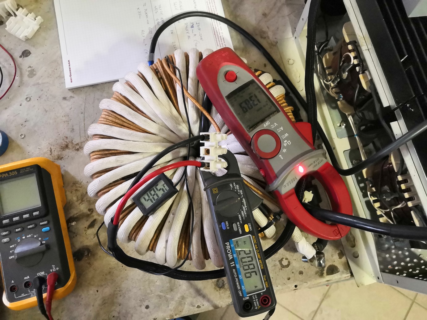 Výsledek je odběr s použitím feritových jader 1,75A při 50V – tedy nějakých 87W (bez feritu 2,4A). No čekal jsem i trochu méně ale neznám kvalitu použitého trafo plechu a to také hraje roli. Bohužel zatím není počasí na nějaké dlouhodobé testování (není energie) ale po zhruba 4 hodinovém testovacím běhu s odběrem 1,5-4,5kW se trafo na stole (bez cirkulace vzduchu) ohřálo asi na 65C, tak uvidím, jak to bude v normálním provozu. Z původního měniče jsem vyvedl vývody na trafo ven a umístil trafo do volného prostoru.