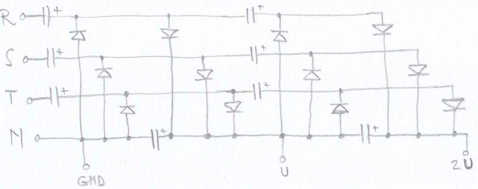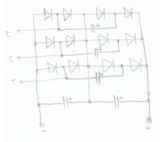 Na rozdíl od předchozího schématu nelze propojit nulák generátoru se záporným pólem výstupu DC (mezi středem AC soustavy a záporným DC výstupem je napětí), předpokládá se tedy zapojení vinutí generátoru do trojúhelníku v síti IT (předchozí schéma předpokládá zapojení do hvězdy v síti TN) a bude mít tedy i poněkud menší výstupní napětí než předchozí zapojení. Zase se díky absenci tří kodenzátorů dá u tohoto zapojení předpokládat, že bude mít tvrdší výstup a nižší cenu.