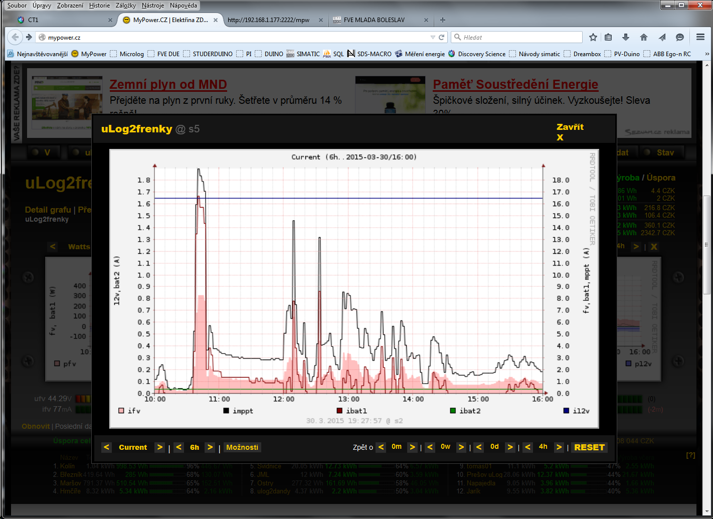 Dnes u nás divné počasí. Chvíli sluníčko, chvíli temno. Nebil jsem zrovna doma ale microlog zaznamenal v jednu chvíli obrovský nárůst proudu (výkonu) na panelech. Proto nedoporučuji vytěžovat regulátory na plný výkon a doporučuji nechat nějakou zálohu právě na tyto krátkodobé výkonové extrémy.