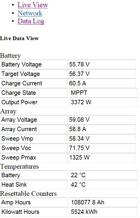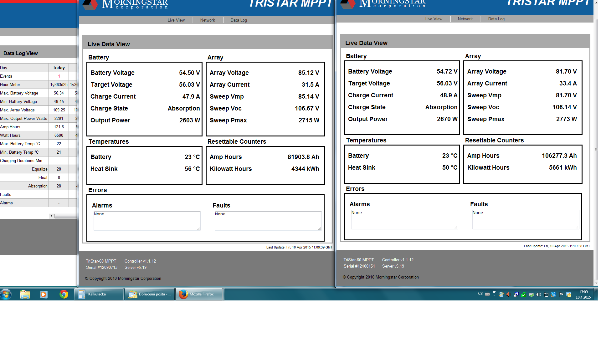15 kWp JJZ + 3x Tristar MPPT60 + Victron 150/100 + 48V LiFePO 850 Ah + UPS 8kW (MPP-Solar 8048 LC) + 4 x nabíječka 1,2 kW (DELTA) Start: 2012