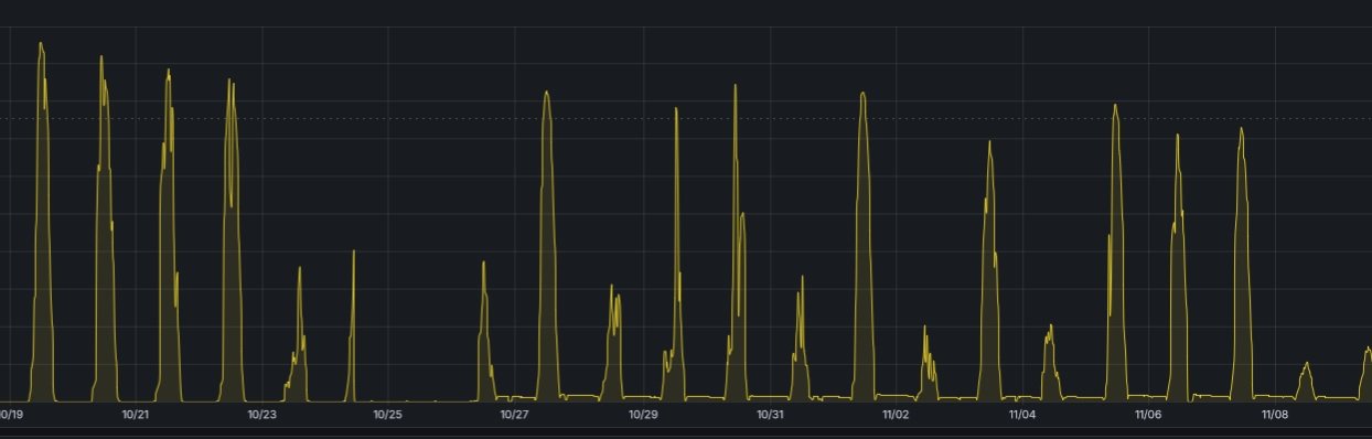 Slunce slábne a je nízko no, pozoruji to hlavně u několika stringů s minimálním sklonem, kdy při zataženu dávají obstojně ale za svitu slunce už je to slabší než dříve o hodně. I když mám vytíženo spotřebou na max, tak víc jak 14kWh denně jsem z toho už nevymáčkl. Krátká doba svitu a dlouhá noc no. Ještě 3 měsíce a začne se to otáčet k lepšímu